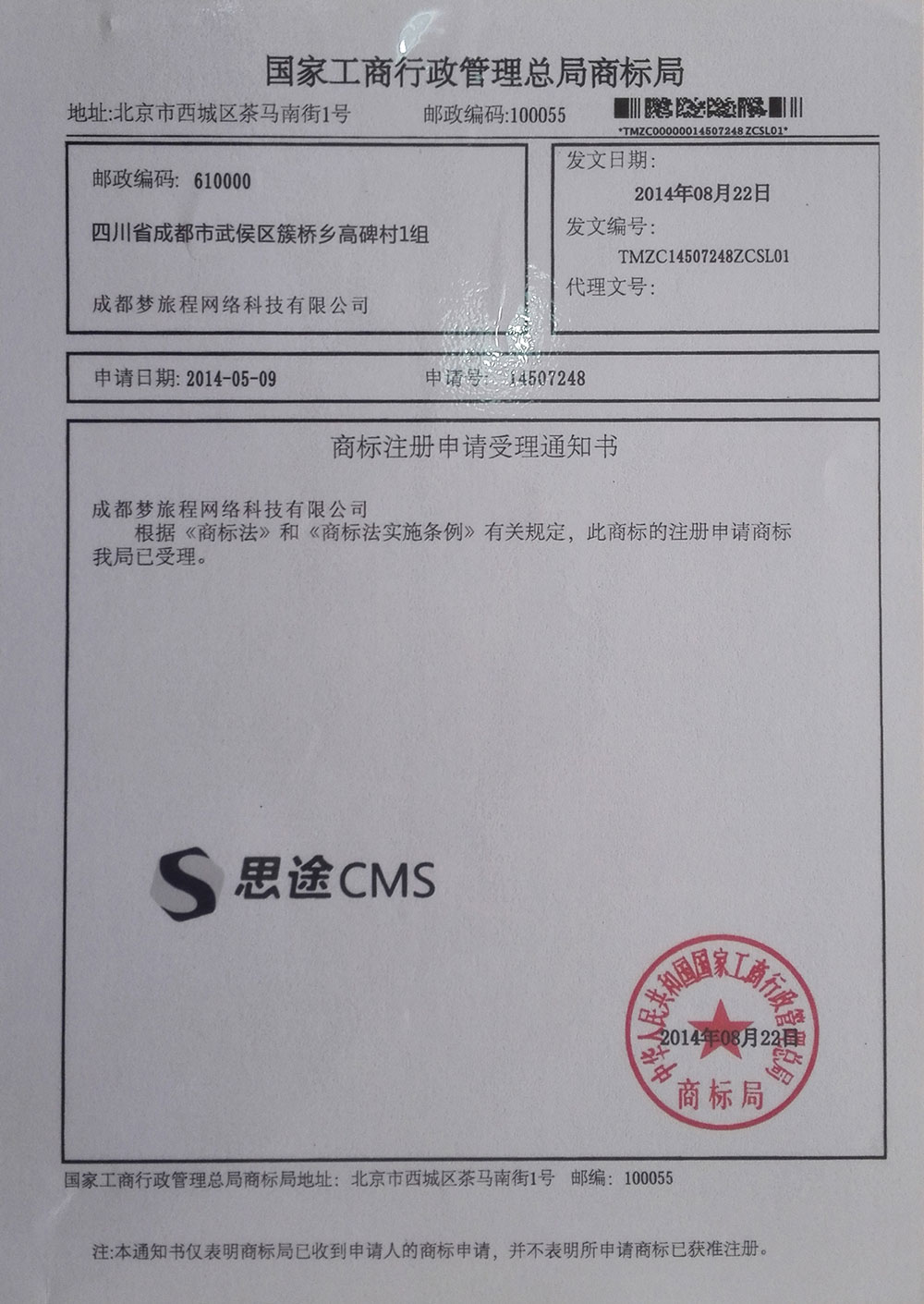 思途CMS商標證書 申請編號:14507248