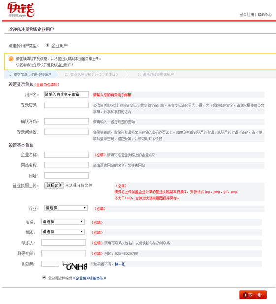 3、填寫相關信息并上傳營業執照后,點擊【下一步】;