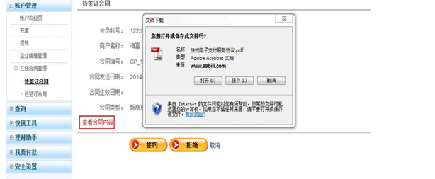 3、點擊查看合同內容,彈出合同文件下載框,點擊“打開”可以打開查看合同,點擊“保存”可以保存合同,