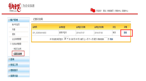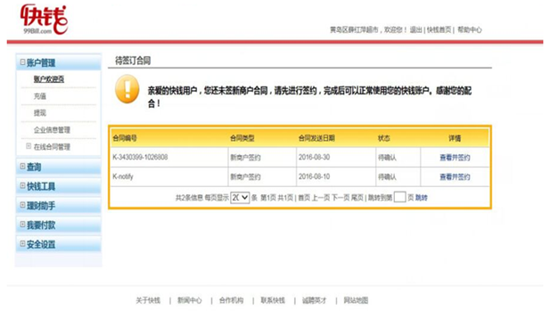 1、使用默認操作員admin賬號登錄快錢賬戶后,賬戶歡迎頁會提示有待簽約合同;