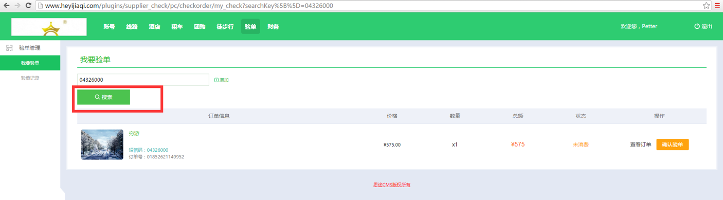 (2)在驗單頁面輸入消費碼,并點擊搜索后,會有相應訂單出現