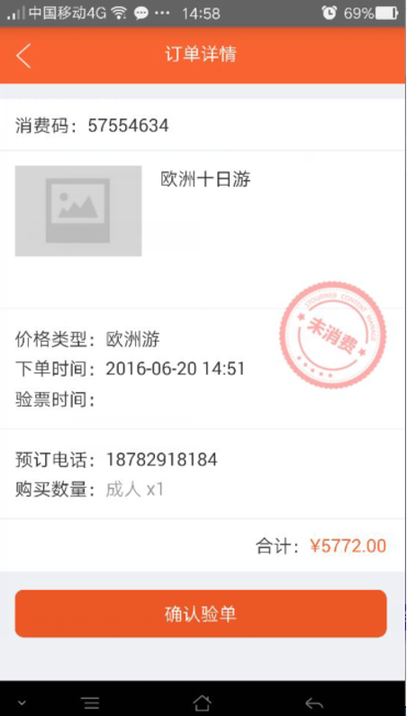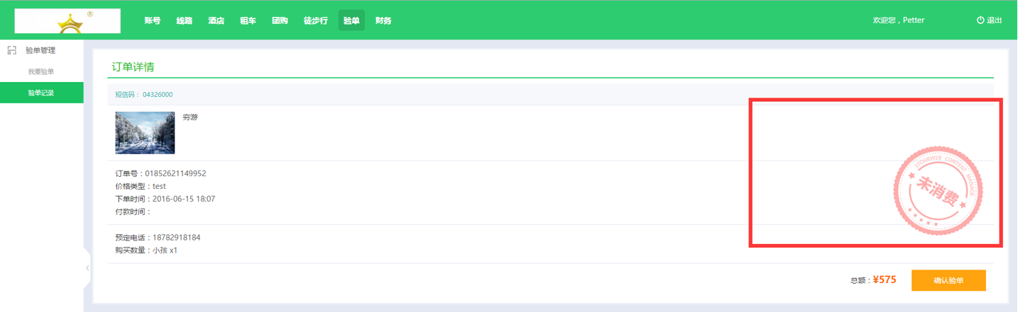 (4) 會顯示相應訂單,確認訂單后,點擊確認驗單,會提示驗單成功,并且未消費變為已消費,驗單完成