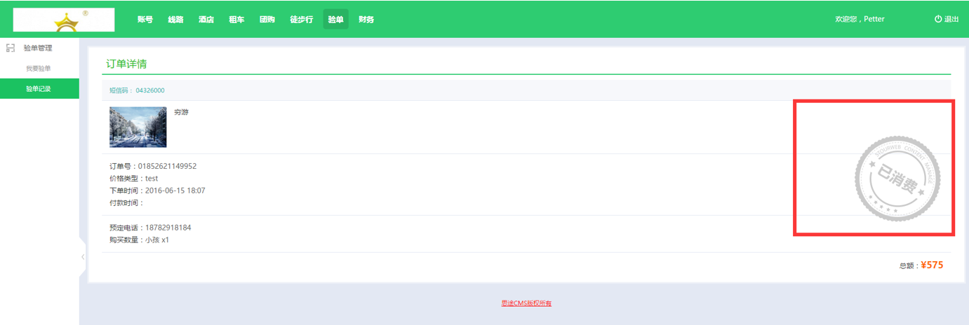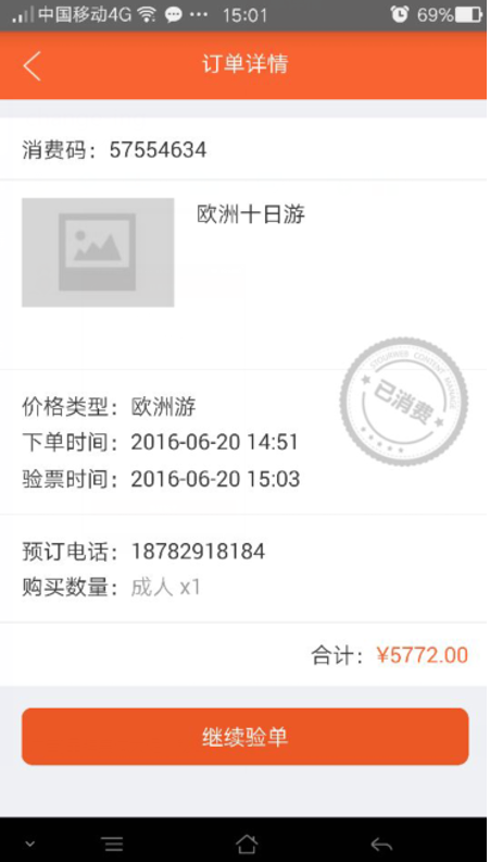 (4) 點擊確認驗單,會給出提示:驗單成功,頁面會顯示已消費,驗單完成