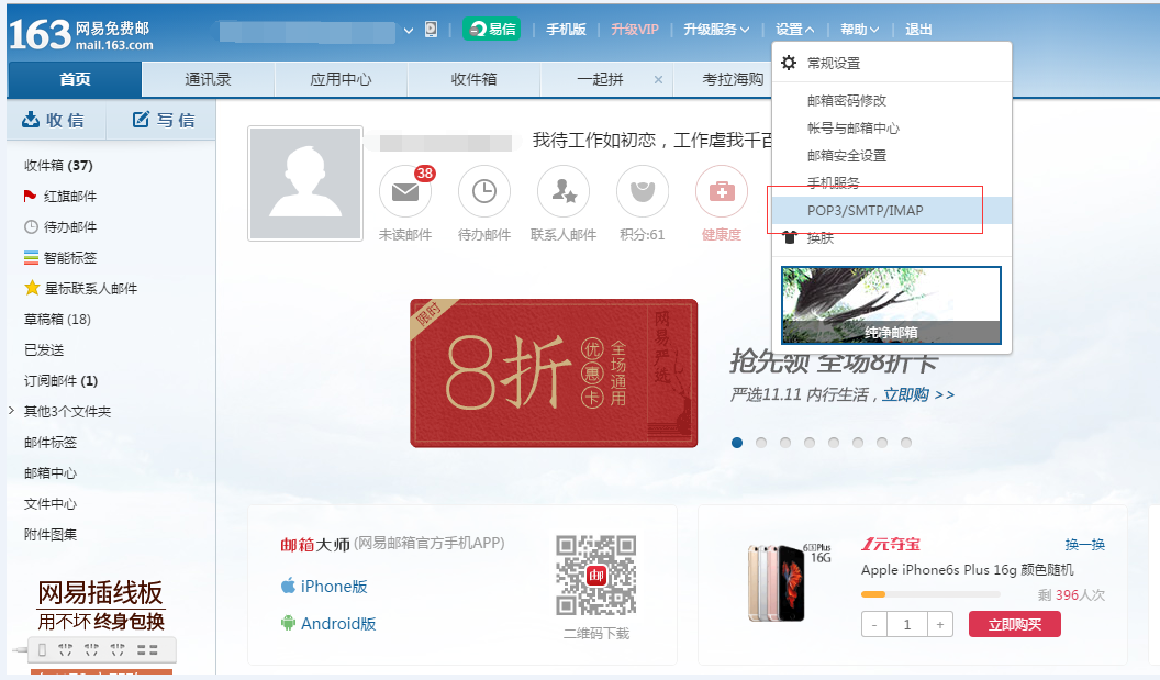 1、進入郵箱首頁,點擊“設置”,進入“POP3/SMTP/IMAP”頁面