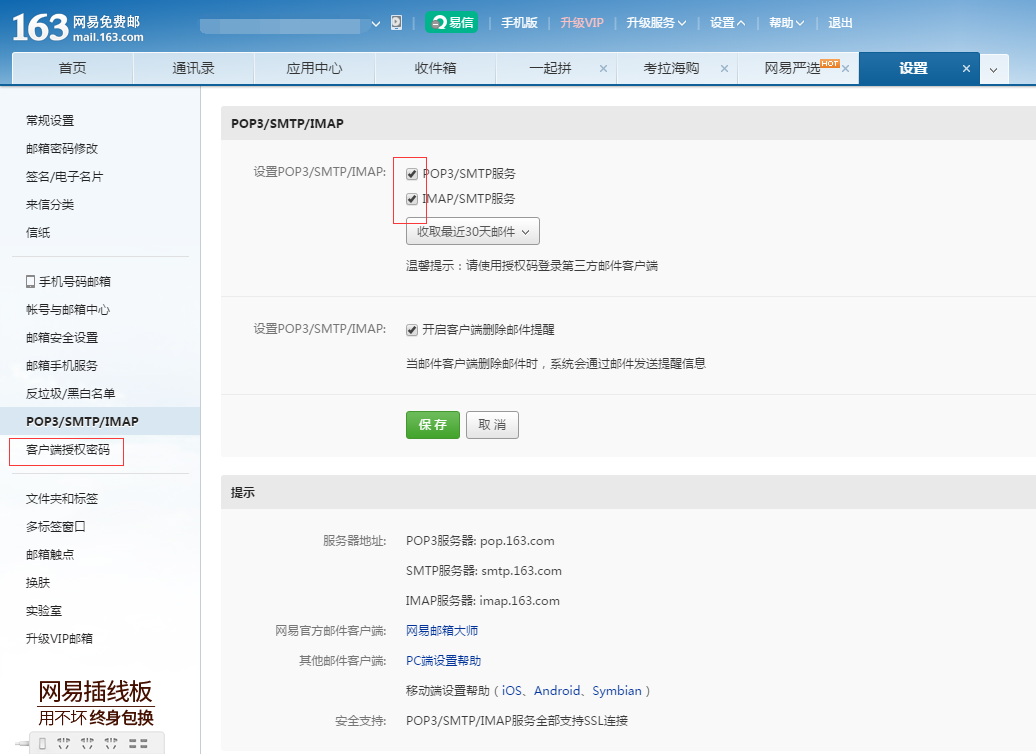 2、確保以下紅框內為選中狀態,然后點擊左邊導航“客戶端授權密碼”進入客戶端授權密碼頁面。