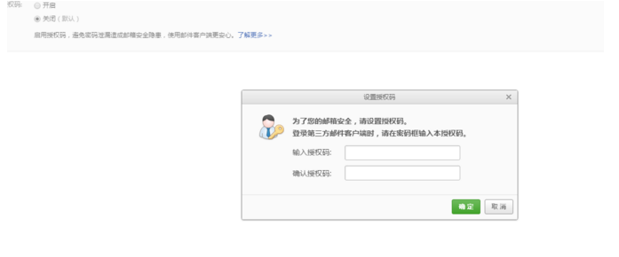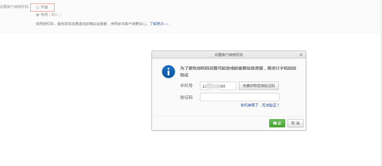 4、輸入郵箱綁定的手機號(如果郵箱尚未綁定手機號,則先綁定手機號),獲取驗證碼,輸入驗證碼后,顯示 設置授權碼 彈窗。