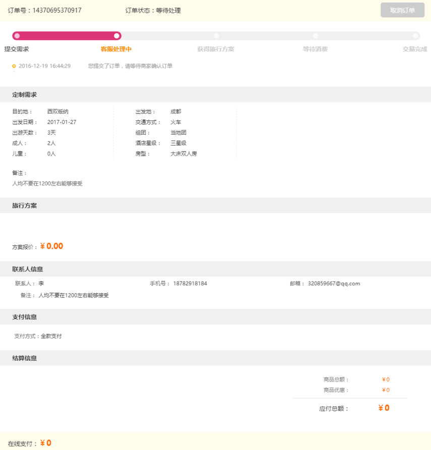 (4)前臺在會員中心查看訂單詳情:可以選擇付款和取消訂單后臺系統配置中勾選了游客信息和發票,則需要填寫信息: