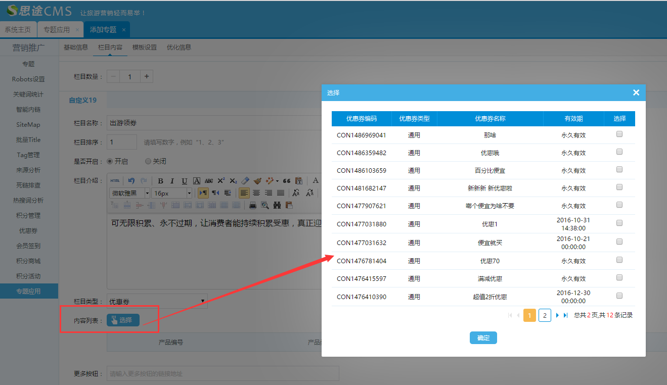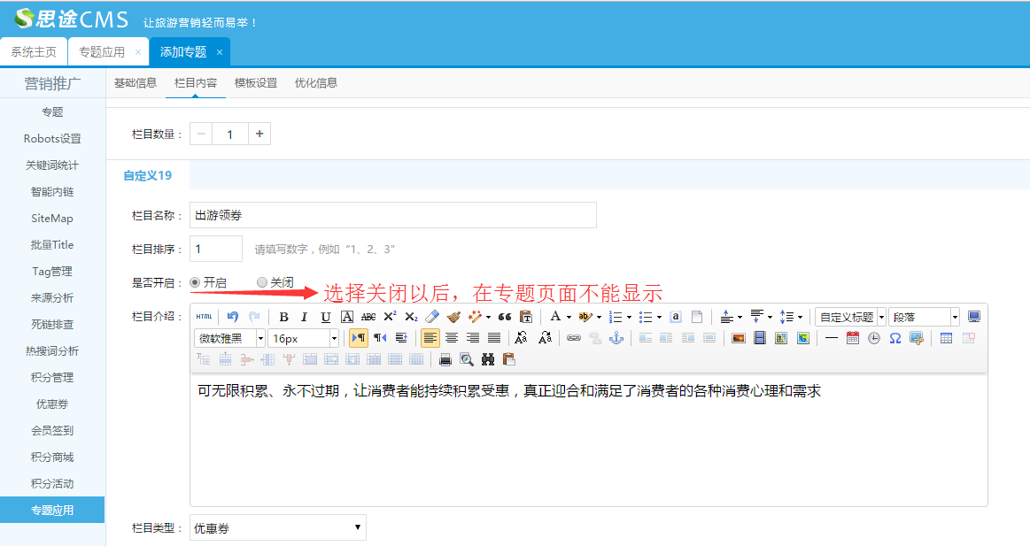 A、選擇優惠券的欄目類型:編輯欄目名稱和欄目介紹、設置排序