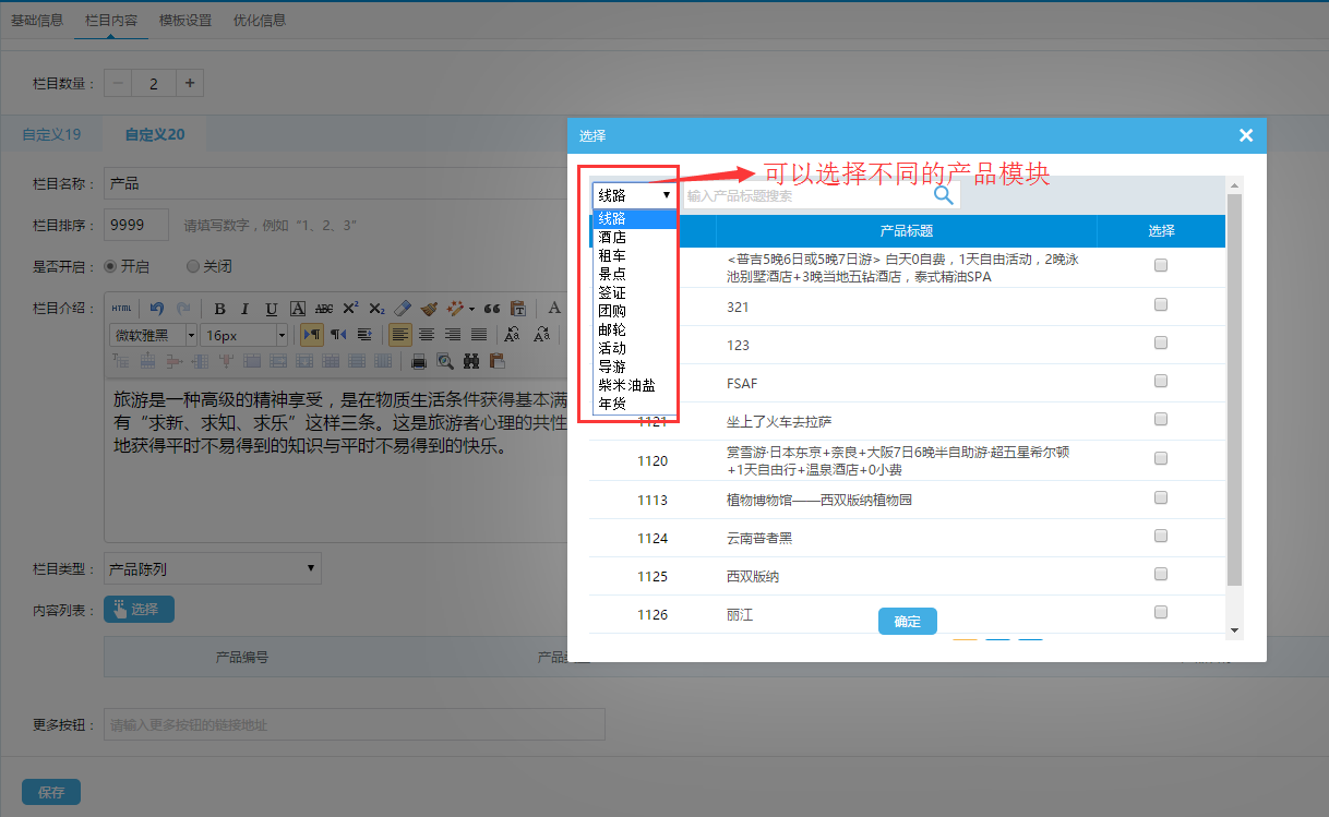 (2)添加產品欄目:只支持已經購買安裝的產品