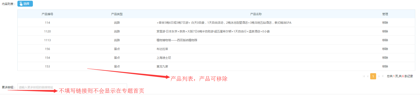 C、更多按鈕的鏈接設置:每個欄目下方會有查看更多的按鈕,設置了鏈接,則會在專題頁面顯示,沒有設置則不會顯示