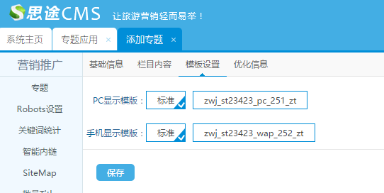 3、模板設置:購買安裝好的模板需要在每個專題下單獨進行應用勾選了模板并保存則可以應用成功