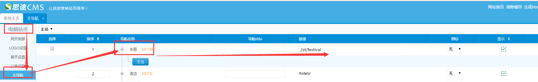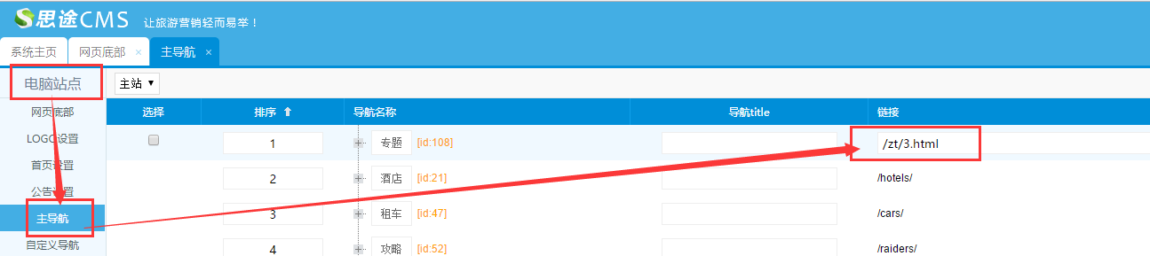 1、在主導航添加入口:電腦站點--->主導航--->添加專題(每一個專題都需要單獨添加導航入口)