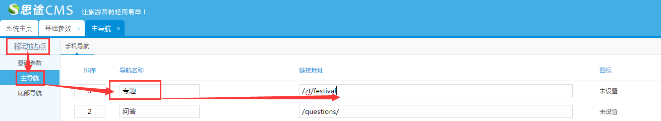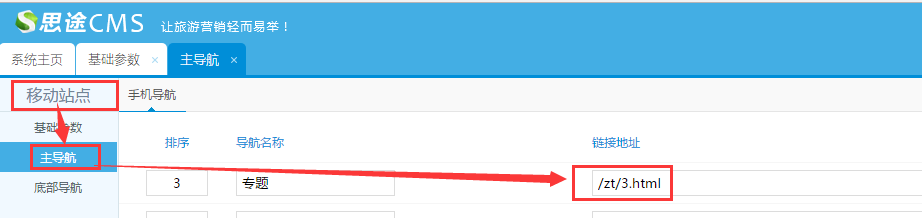 1、在主導航添加入口:移動站點--->主導航--->添加專題(每一個專題都需要單獨添加導航入口)