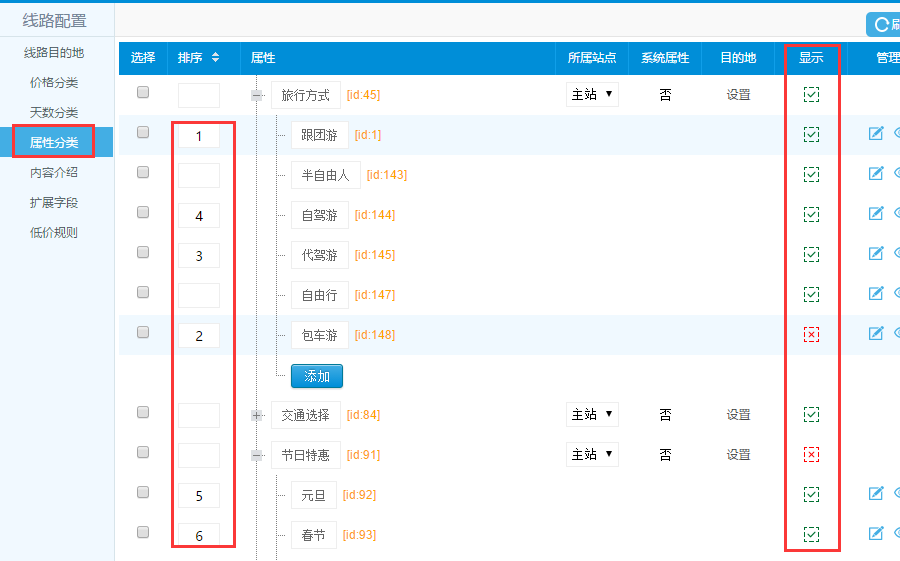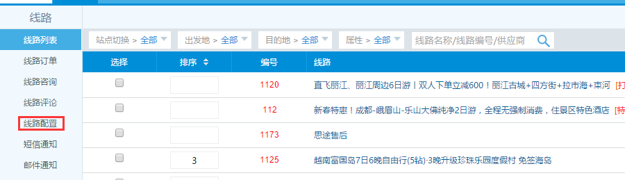 此版塊調取的數據是線路欄目的產品,可選擇5種屬性的產品(數字排序前5位屬性)來調用,設置方法如下: