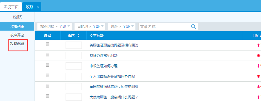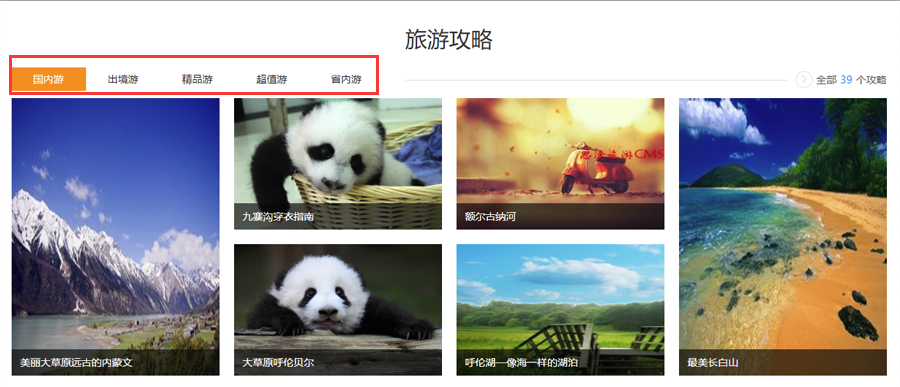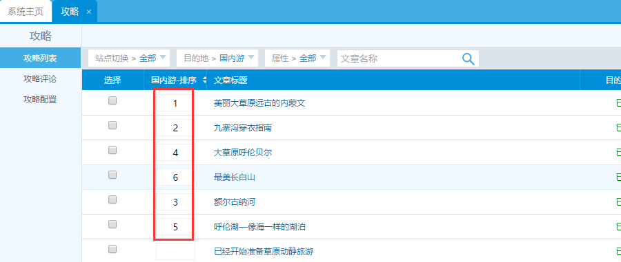此版塊調取的數據是攻略欄目的文章,可選擇5個目的地的產品(數字排序前5位屬性)來調用,設置方法如下: