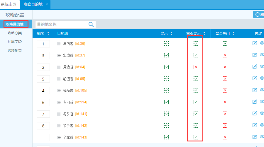 在顯示勾選上的前提下,然后按首頁顯示勾選的順序來排序(沒勾選首頁顯示的周邊游將不會顯示)