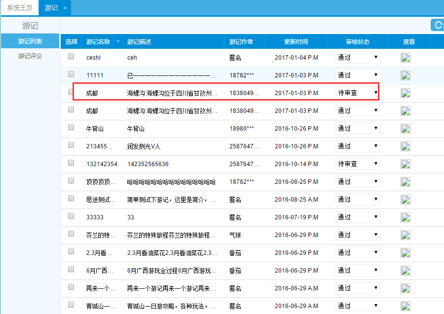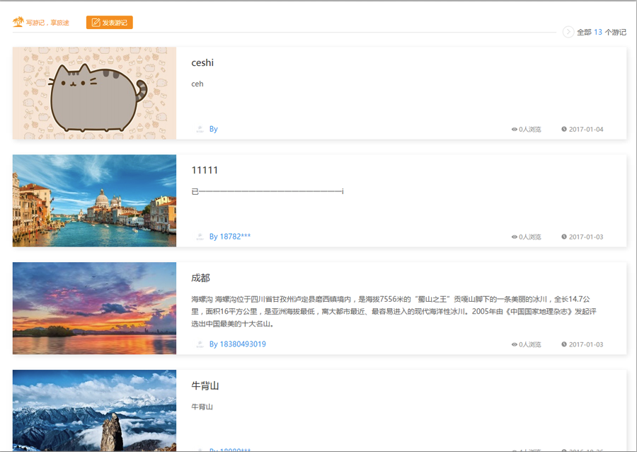 此處顯示的內容不是管理員可控的,是會員在前臺發表的游記,顯示最新的顯示在最前面(未審核通過的不顯示):