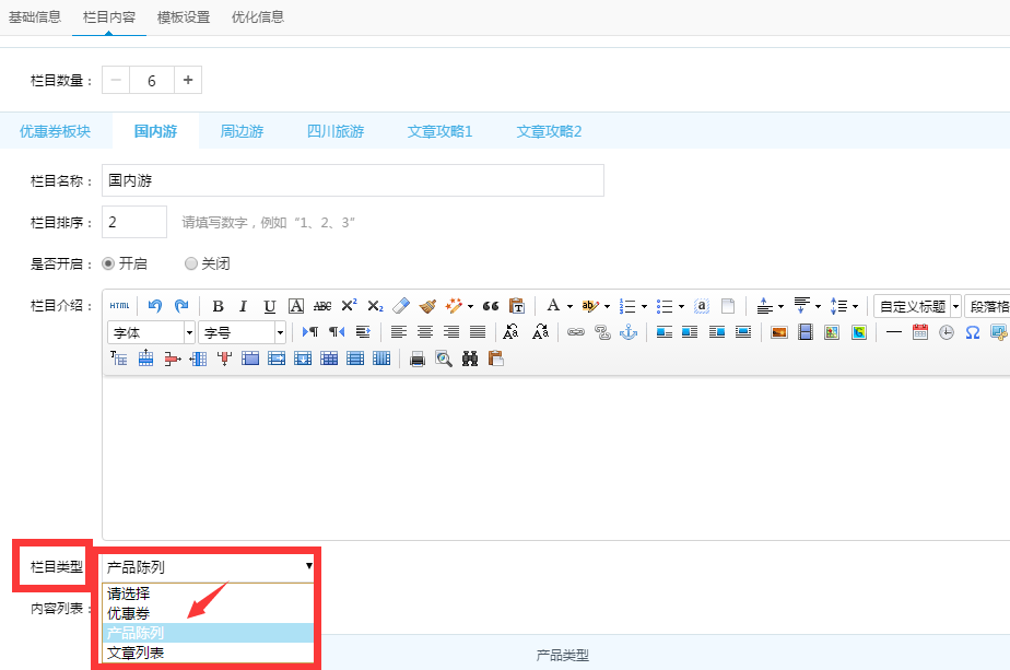 PS:因為在欄目類型處選擇的是產品陳列,所以篩選框處不會出現攻略等軟文選項。