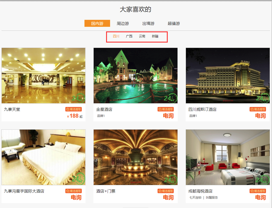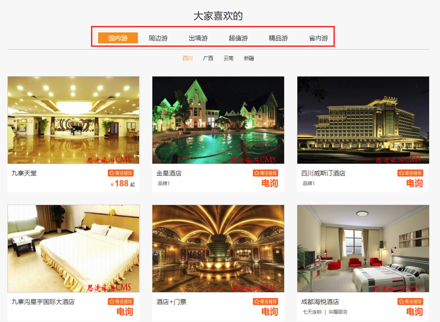 此版塊是提取酒店產品,可以設置六個一級目的地,以下圖為例共有國內游、周邊游、出境游、超值游、精品游和省內游: