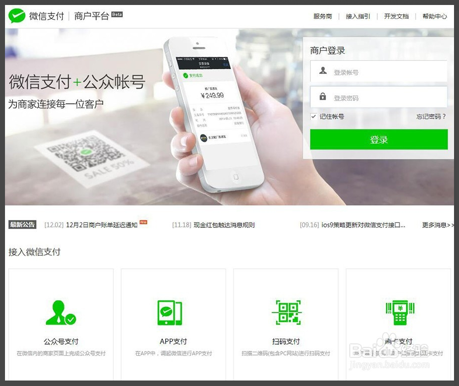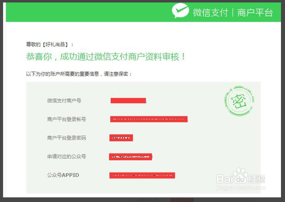 五、獲取商戶平臺賬號密碼——當資料審核通過后,微信支付會發送驗證通過的信息,并且把商戶帳號和密碼發送到填寫的郵箱里面,點擊驗證就會跳轉到微信支付的商戶平臺