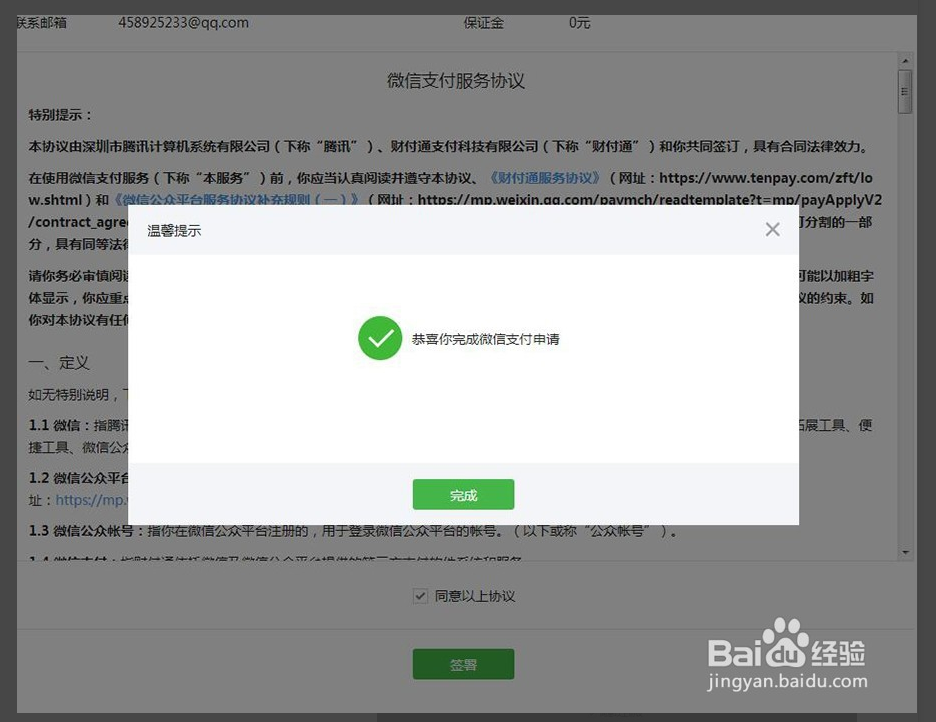 九、商戶平臺協議簽署——隨機款驗證完成后馬上會提示“前往簽約”,仔細閱讀微信支付服務協議,并確認商戶信息,沒問題后就同意協議,點擊簽署,就會提示已經完成微信支付的申請