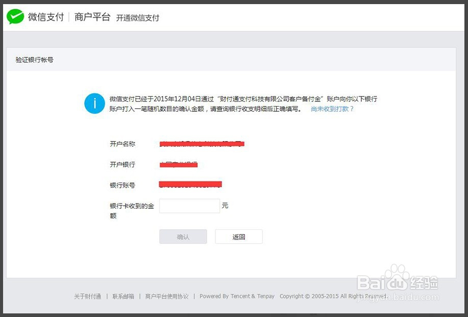 八、商戶平臺賬戶驗證——點擊賬戶驗證右邊的驗證,輸入隨機打款金額進行驗證