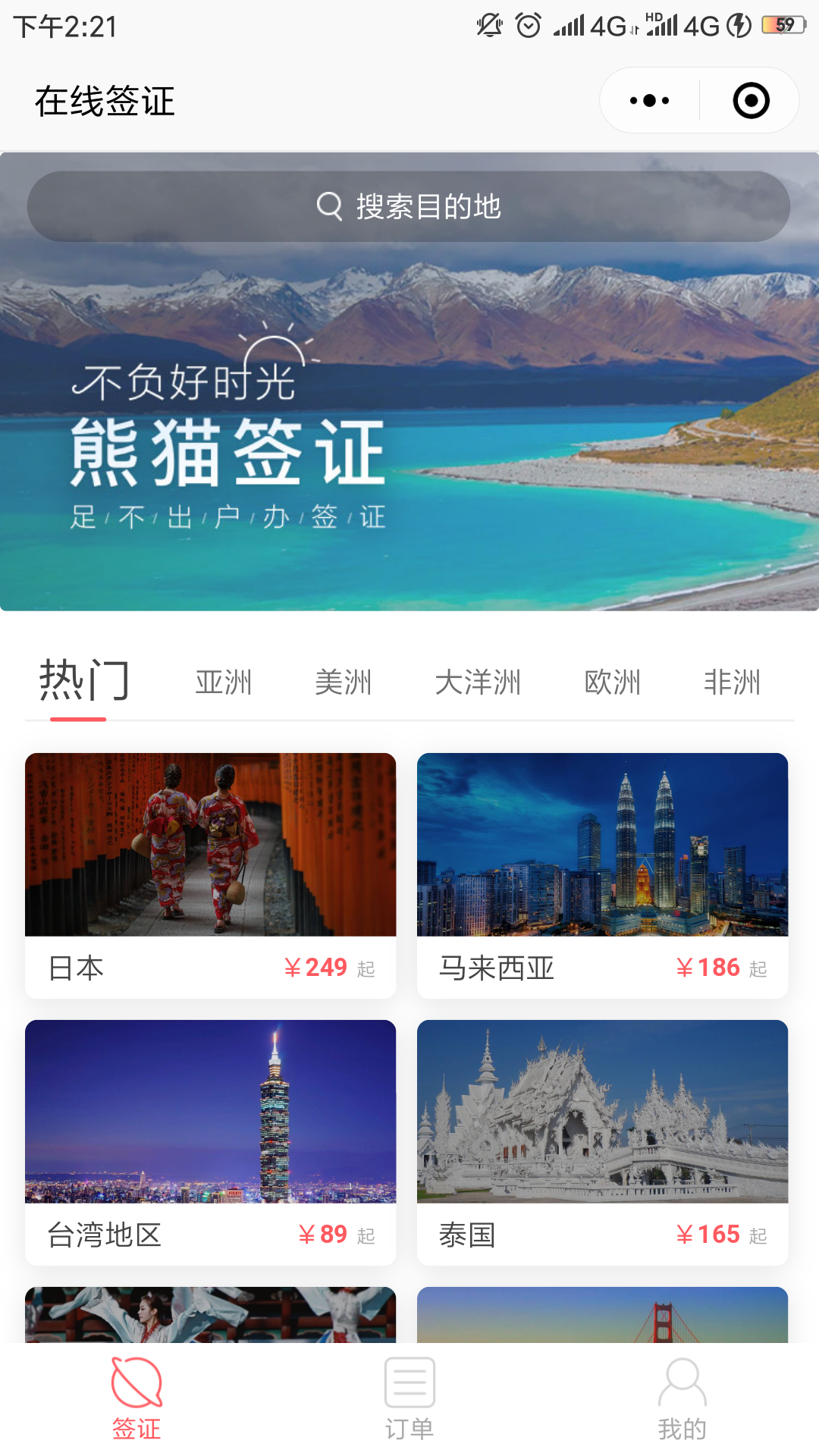 該小程序的首頁,游客既可以查找簽證目的地,又可以在頁面的下方看到商家為簽證所提供的增值服務,同時還有多種簽證類型供你篩選適合自己的,大大滿足了游客的需求的多樣化。