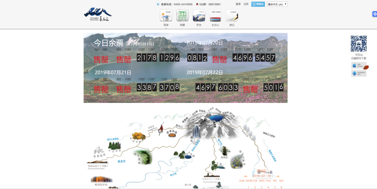 長白山網站以純白色作為主色調,整體簡單、干凈,很符合長白山的景區特質,令游客第一時間想到雪山。網站包含首頁、導游、購票、驢友、長白山、游記等模塊。Banner處顯示的是今后三天的余票,可直接購買;下方還有著清晰的長白山游玩線路圖,點擊景點會有多張圖片供游客欣賞。該網站還支持多種語言瀏覽,注重國際化的發展方向。