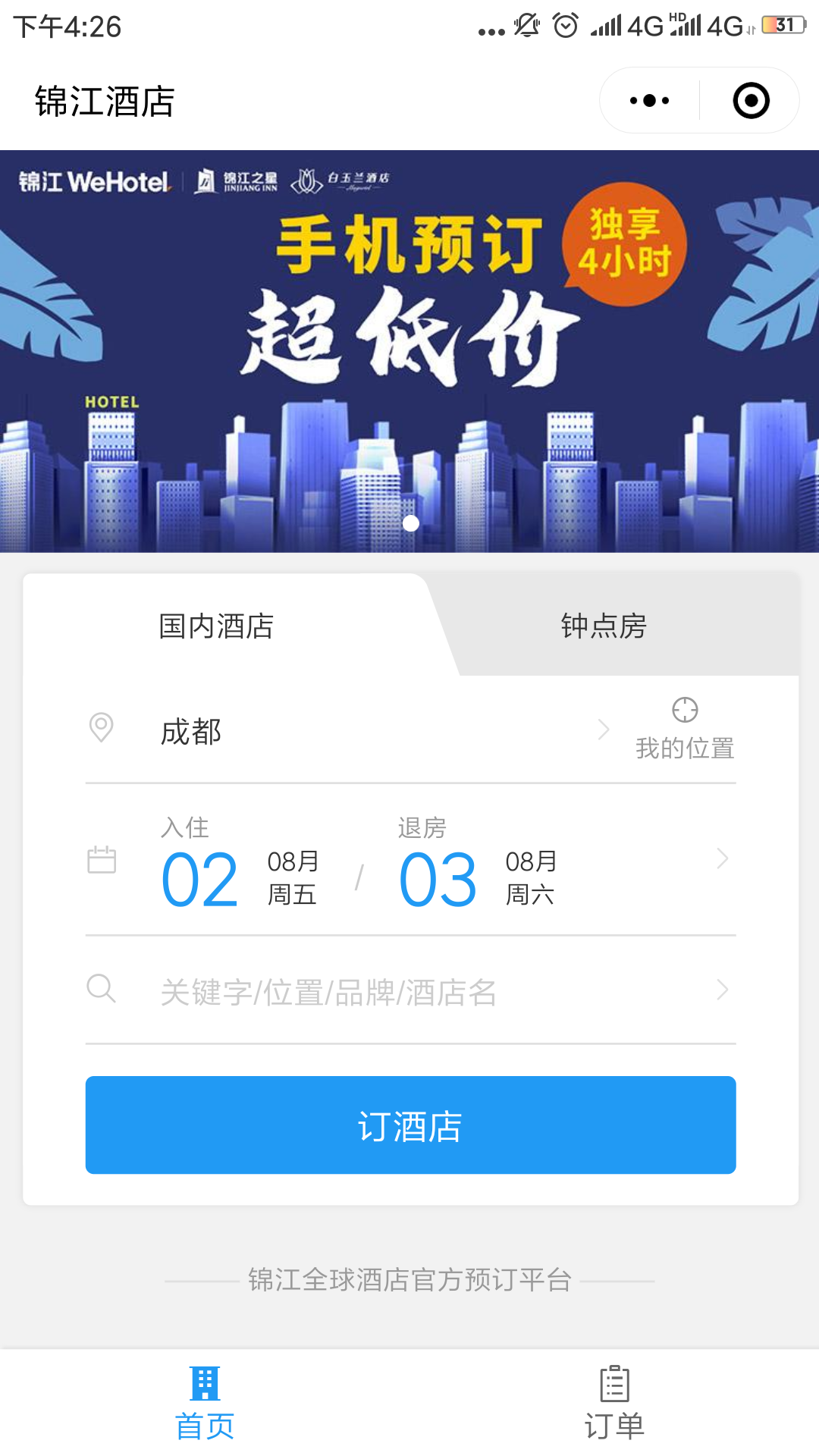 該模板的首頁分為兩大板塊:一是用banner圖展示出該酒店的優惠活動;二是酒店預訂功能板塊,游客可通過選擇國內酒店或者鐘點房,再根據具體的地理位置,查詢周邊附近的酒店,選擇價格合適的酒店入住。