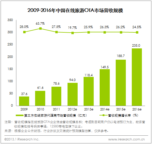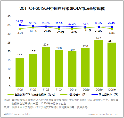 艾瑞咨詢數據顯示,2012年中國在線旅游OTA市場營收規模為94億元,較2011年的78.6億增長19.7%。季度數據來看,2012年Q4在線旅游OTA市場營收規模為25.1億元,同比增長20.8%,環比下降5.8%。