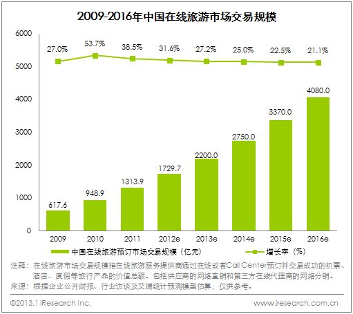 艾瑞咨詢認為,2012年中國在線旅游市場交易規模快速增長,主要源于機票、酒店、旅游度假等細分市場不同程度的增長,具體而言:機票依靠較高的發展成熟度,繼續以較快的速度向傳統機票預訂滲透;酒店在線預訂率低,但隨著核心OTA及連鎖酒店在線業務的拓展,酒店等預付產品的市場認可,酒店在線預訂得到快速增長;旅游度假方面,周邊游、出境游的火熱,以及目的地營銷的興起,使得旅游度假成為增速最快的細分市場。