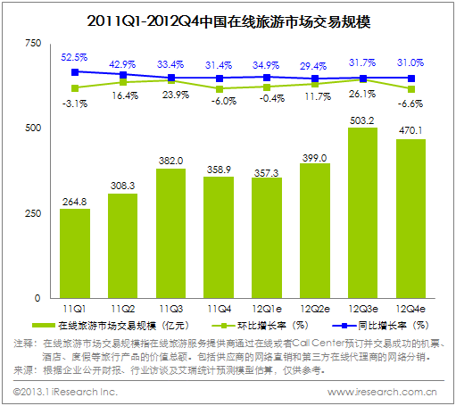 艾瑞咨詢統計數據顯示,2012年中國在線旅游市場交易規模為1729.7億元,較2011年的1313.9億元相比增長31.6%。從季度數據來看,2012年Q4在線旅游交易規模為470.1億元,同比增長31%,環比下降6.6%。