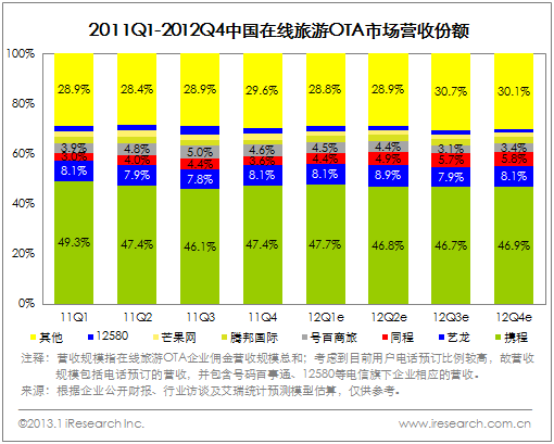 截止2012年Q4,中國在線旅游OTA市場營收份額顯示,攜程以46.9%的占比位于絕對地位,藝龍、同程網、號碼百事通分別以8.1%、5.8%和3.4%的市場份額處于第二陣營,騰邦國際、芒果網等位于其后。