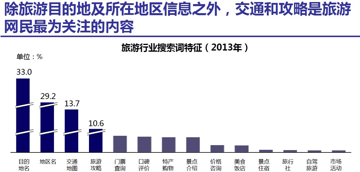 通過以上數據我們不難發現,在旅游過程當中,游客對交通、住宿、門票、攻略等一系列的搜索占據的總體比重非常高。傳統旅游企業經營的是打包產品的銷售,而現目前旅游網民對旅游過程中的細節更為關注,自助游的趨勢越來越明顯。通過以上數據我們可以看出,自助游已經是一個不可逆轉的趨勢,旅游企業是否該做出相應的變化,以求企業自身的發展。