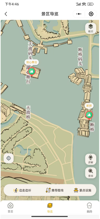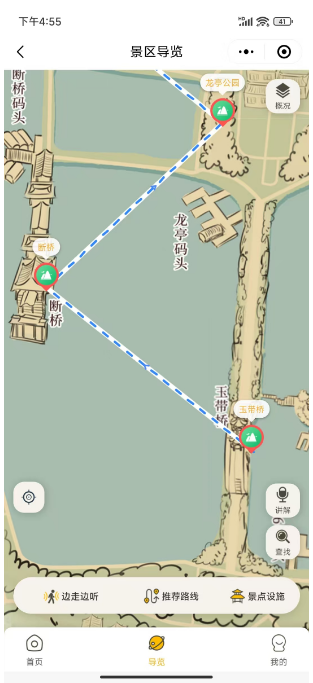 游客通過小程序可定位周邊景點,開啟邊走邊聽自動講解,查看地圖定位與景點圖文介紹,切換多語言導覽,并參照官方推薦路線便捷規劃行程。支持跳轉菜單實現多業態互相引流,全面提升景區導覽體驗與運營效率。