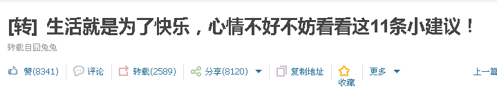 首先,每當我們發表一篇文章,一定要分享到空間再轉載到微博,因為我們點擊進入一篇文章,標題下方有贊、評論、轉載等一系列標簽。這些評論和轉載的次數就是對一篇文章最直接最可觀的評價。如果數量不錯,網友會更愿意看下去。這樣的話才讓多個地方都能帶來流量。