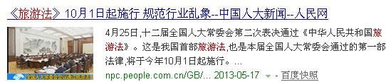 我們在百度搜索框中輸入“旅游法”彈出的的網頁中會出現這樣圖文并茂的網頁條。如下圖所示: