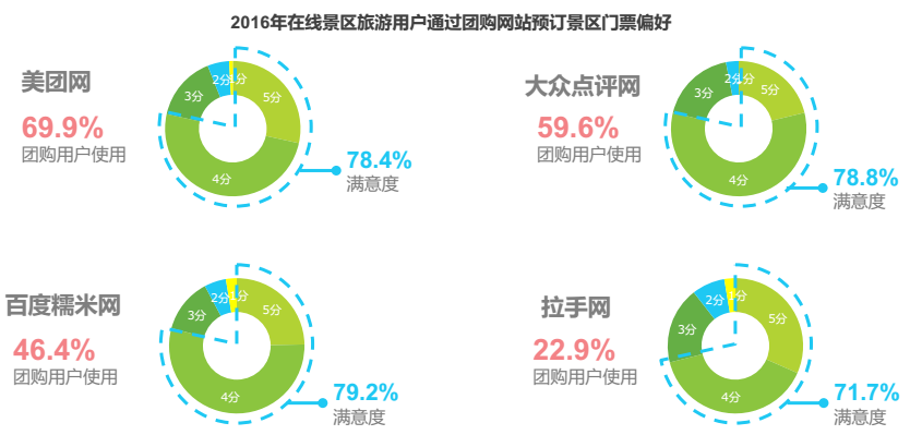 69.9%的團購用戶使用過美團網預訂景區門票,大眾點評以59.6%的使用率位居第二位,由此可見新美大在團購市場的品牌影響力非常巨大。從餐飲、演出逐漸跨界到景區門票產品,新美大將客源流量優勢覆蓋到旅游目的地。從滿意度來看,四大團購網站的高分值綜合比例都超過了70%,用戶對團購產品的認可度較高。