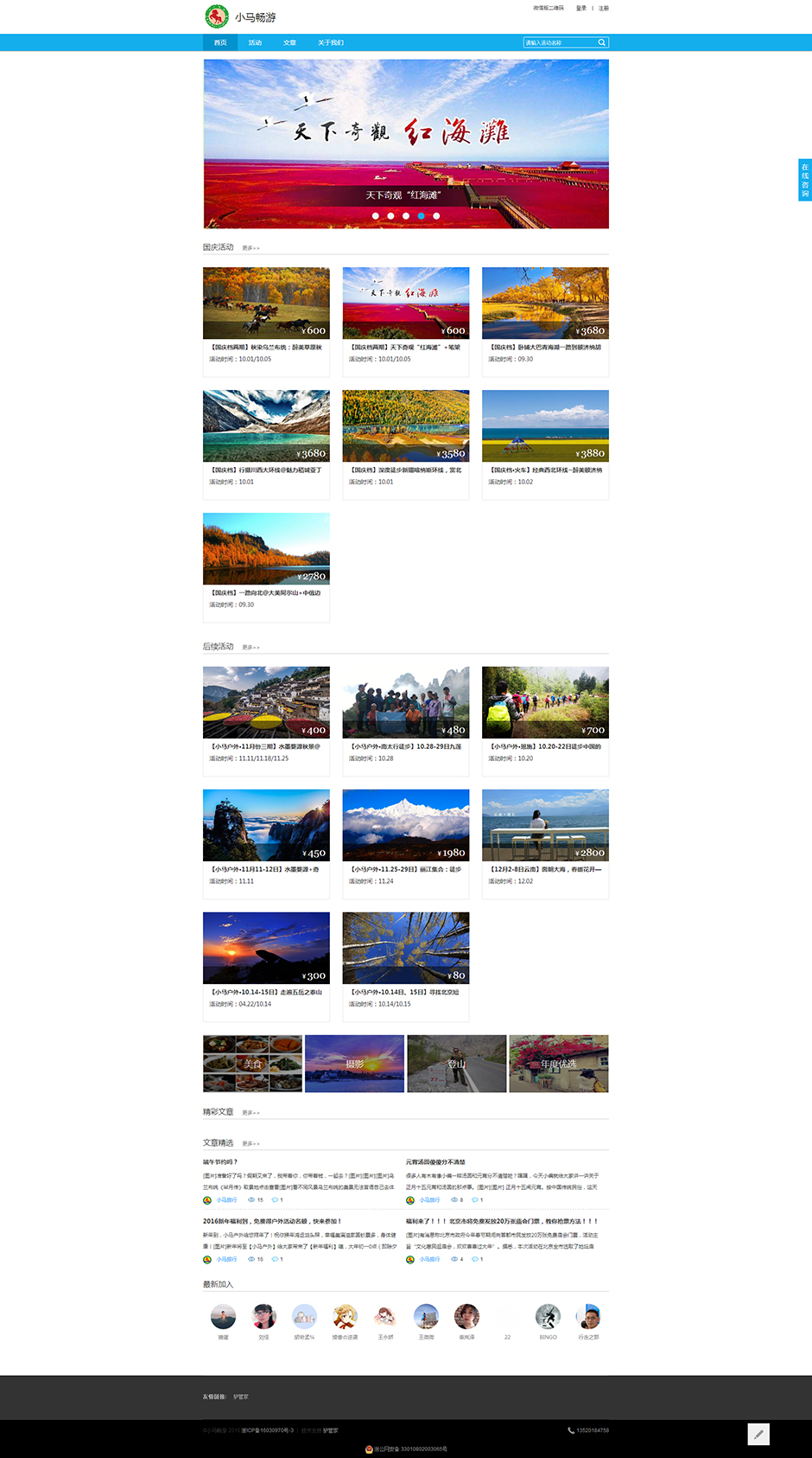 最后,也是最重要的一點,戶外俱樂部盡管也是屬于旅游網站,但是和一般的旅游網站在業務性質上就存在著很大的不同,因此戶外網站一定要突出自己戶外旅行的特質,讓用戶一看就知道網站是專注做戶外旅行的。比如說有些戶外網站導航欄分類是首頁、周邊短途、國內長途、出境旅行等,這和一般的旅游網站分類相似,就未能突出戶外俱樂部活動這個主題,觀察綠野、8264等做得比較好的戶外網站,可以看出它們的分類一般是首頁、活動、目的地等,簡單明了,符合其特質。