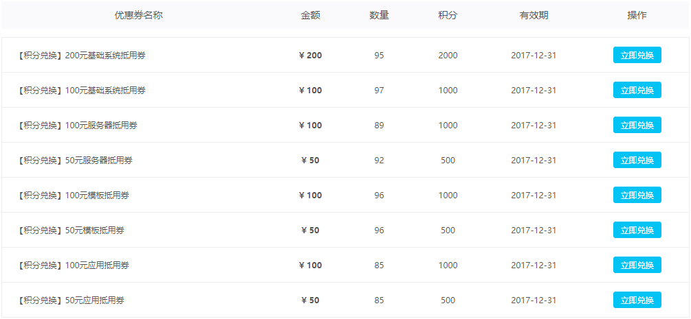 思途目前優惠券分為現金券,授權券,服務器劵,應用券和模板券。除現金券是以活動或用戶獎勵的形式發放意外,其余所有優惠券類型都可通過積分在會員的個人中心內自主兌換。(賺積分的作用就在這里啦)