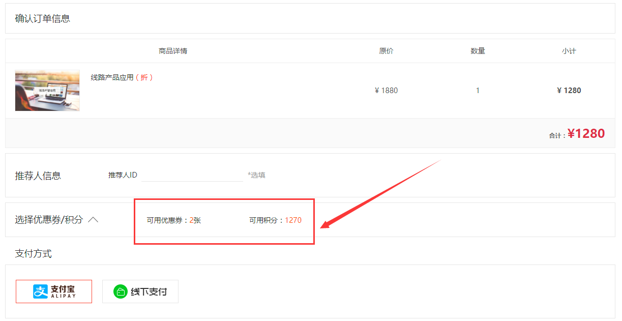 除積分之外,優惠券也可以直接抵扣訂單總額。優惠券可以和積分疊加使用,在購買產品時,同時使用積分和優惠券,將可以獲得最大的優惠。