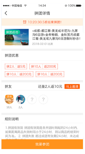 試想,如果有一個熱愛旅游的張阿姨,每年都要休假去看大好河山。這次,她在瀏覽九寨溝線路產品時,看到了參與拼團旅游,就能拿到5元,甚至200元的返現時,會不會心動?而且返現不只自己能拿,參與拼團的好友也可享受,那張阿姨會不會也將產品鏈接分享到自己的微信上,鼓勵姐妹們一起加入呢?而且,如果已有的團都滿了,阿姨還可以發起一個新團。一鍵分享的事,怎么樣自己都不算虧。張阿姨們的心里或許都打著這樣的算盤。