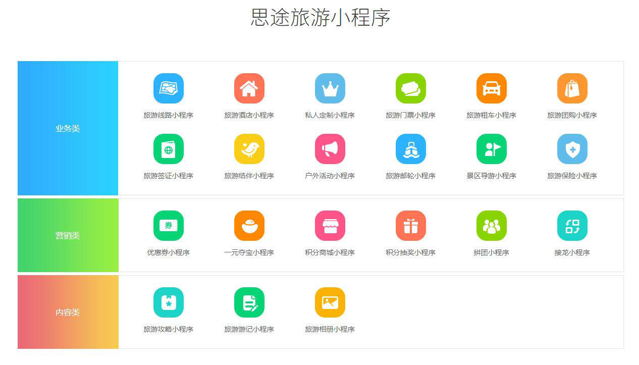 大家都知道,早在小程序剛推出之際,思途為了幫助大家搶占這波流量紅利,率先研發了多種小程序產品,全面覆蓋了業務開展、營銷推廣、內容分享這三大類旅行社主要業務。同時,思途本著不斷優化、精益求精的精神,對小程序也持續著改進與完善的工作。