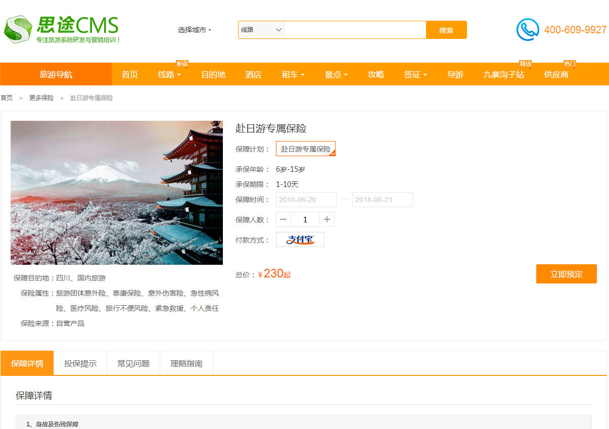 既然旅途之中的意外難以預測,為客戶購買保險,也可以幫助我們商家規避一定的風險。比如,我們可以通過思途CMS的保險產品應用,給自己的線路產品搭配相關的保險,既可以免去客戶單獨購買保險的操作,為游客提供出行保障,增強游客其信心;同時又能自行收集客戶的保險信息,在游客不幸遇險后也可第一時間做好應急工作,明確責任降低自身風險。