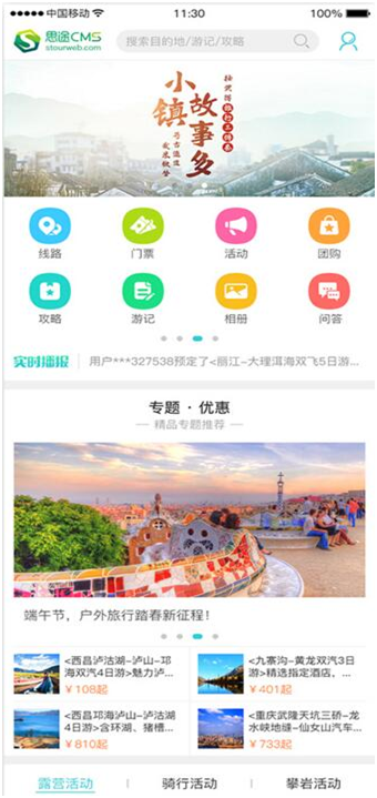 相比于PC端,移動旅游網站的模板頁面設計更需要簡潔干凈,案例中無論是在首頁的配圖選擇和導航欄的結構設計上都完美做到了這一點。清新的配圖,簡潔的導航欄,以及文案設計上都最大限度照顧了游客的瀏覽體驗,平凡卻并不平庸才是這個移動端旅游網站模板的真實寫照。