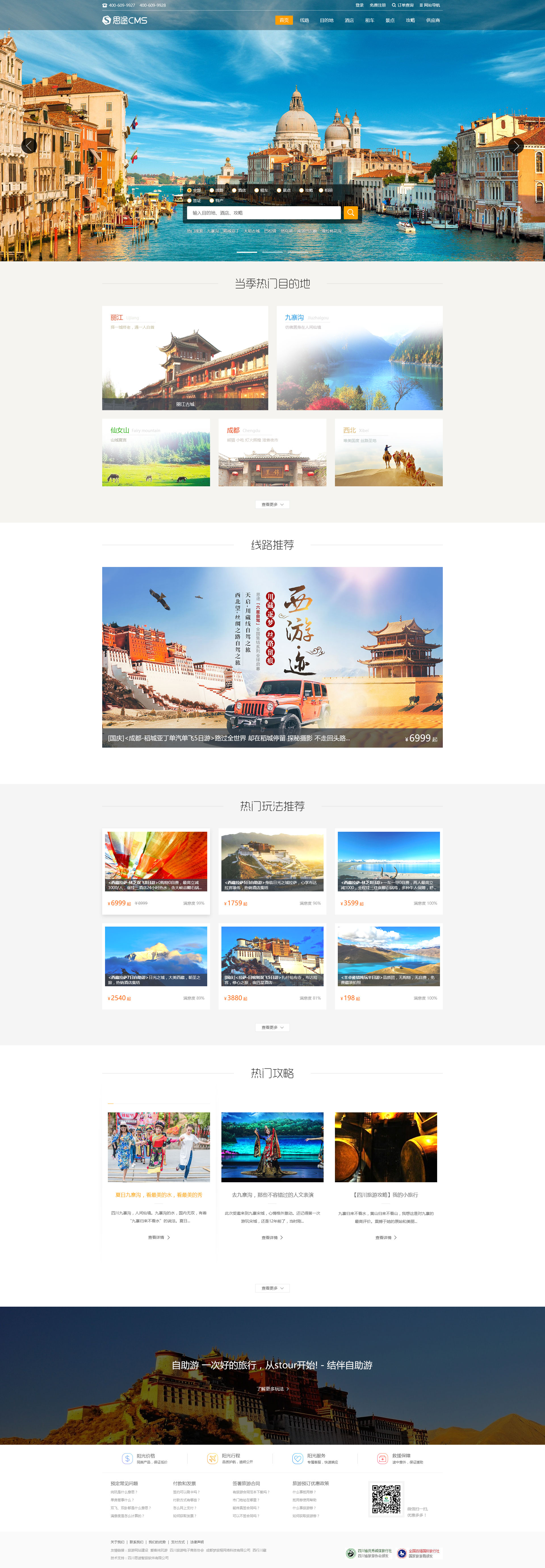 旅游網站模板的首頁除了banner圖以外,還有下方的欄目介紹模塊,一個有內容的旅游網站才是用戶喜愛的旅游網站。思途的這套旅游網站模板選了大概四個模塊進行展示,包括熱門目的地推薦,線路推薦,熱門玩法推薦,熱門攻略。不算多也不算少,板塊展示切忌不可過長,過長的下拉時間會讓用戶失去耐心,所以,我們在首頁模塊中盡量選擇用戶感興趣的內容進行展示。而各個板塊中的內容也應選擇高質量的配圖和文案,以引導用戶的進一步點擊。