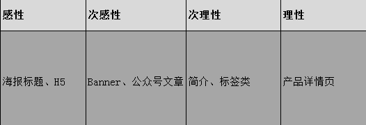 為了便于大家理解,我們可以通過表格一一對應我們的文案類型以明確不同的定位。