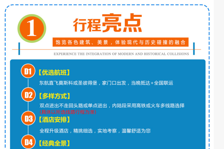 最后一種理性文案,則主要是為了增強用戶的信任感。我們旅游類的產品,一般是先激起用戶了解的欲望,再通過詳盡的說明增強可信度,打消用戶的疑慮。我們的產品詳情頁就是在發揮這樣的作用。在瀏覽產品時,用戶如果被我們所給出的標簽所吸引,那在了解具體的行程詳情時,就會更關注這方面的細節。所以,我們在編寫行程說明的時候,就應該就產品的賣點標簽進行說明,比如我們強調了旅行的高品質,就應該在住宿、餐飲中強調高檔的定位,也可列舉具體的酒店名稱、服務細節,來增強自身的說服力。