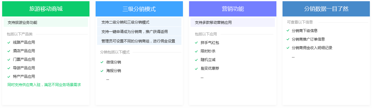 利用“移動商城+裂變分銷“的模式,旅游企業將具備超強的市場營銷能力, 企業設置分銷傭金,用戶通過多種分銷渠道,將產品分享、推廣給熟人和好友,賺取相應傭金