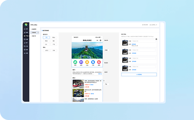 酒店自建商城,可靈活發布產品,商品類型可自由擴展,包含特產、餐飲、景區門票、酒店商品等。